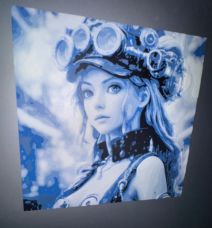 3D printed 8in x 8in Steampunk Hueforge poster.
